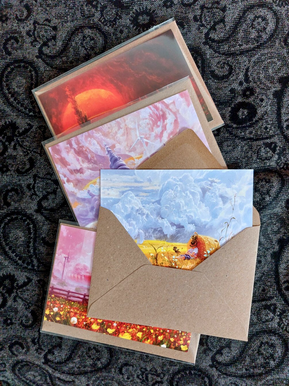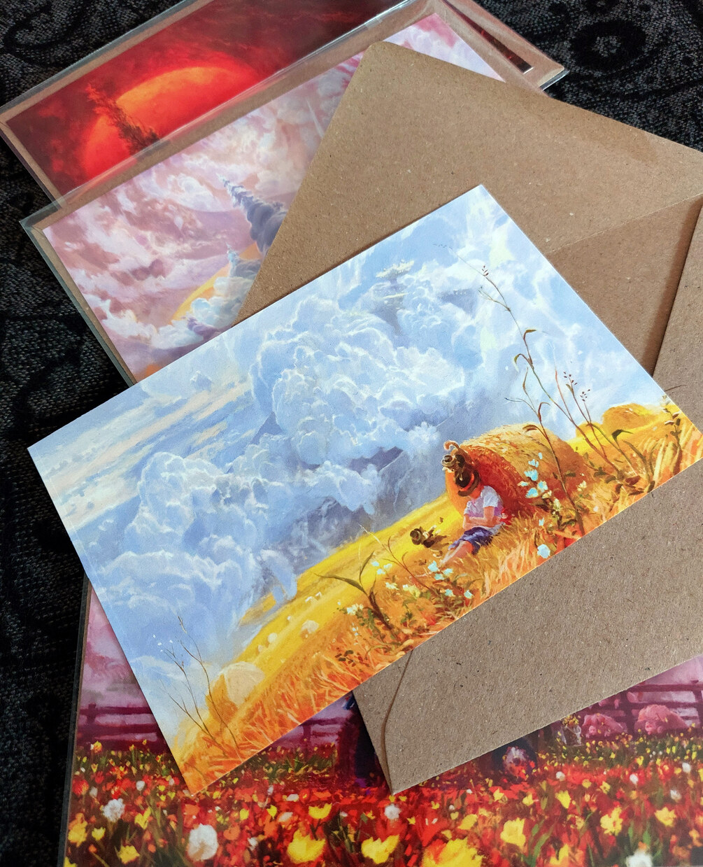 A pack of 4 physical postcards with artwork by Zhillustrator and a custom back side.